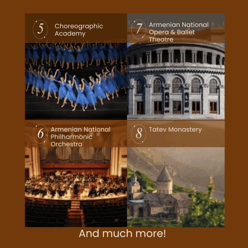 Dancers may participate in special activities at the Yerevan State Choreographic College, engaging in training sessions that reflect Armenia’s rich ballet tradition.